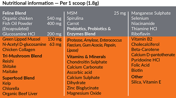 Together, they support all key areas of a cat's health. Immunity, digestion, joint health, energy levels, skin & coat health, and more.