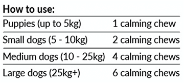Give the appropriate number of chews to your dog each day based on the chart below. Under-serving your dog may mean you do not see the desired effects.