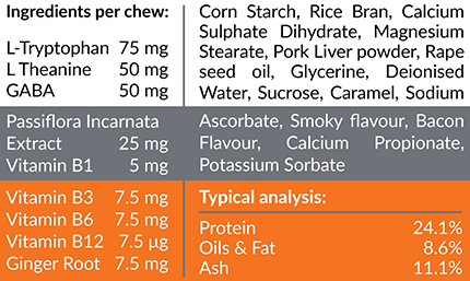 Relax and Restore is a calming chew which helps your dog achieve a calm relaxed state. It reduces nervous and impulsive behaviour, eases away anxiety and shields them against stress.